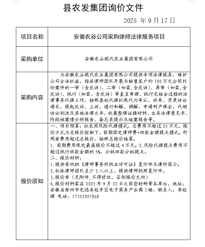 安徽农谷公司采购律师法律服务项目询价公告