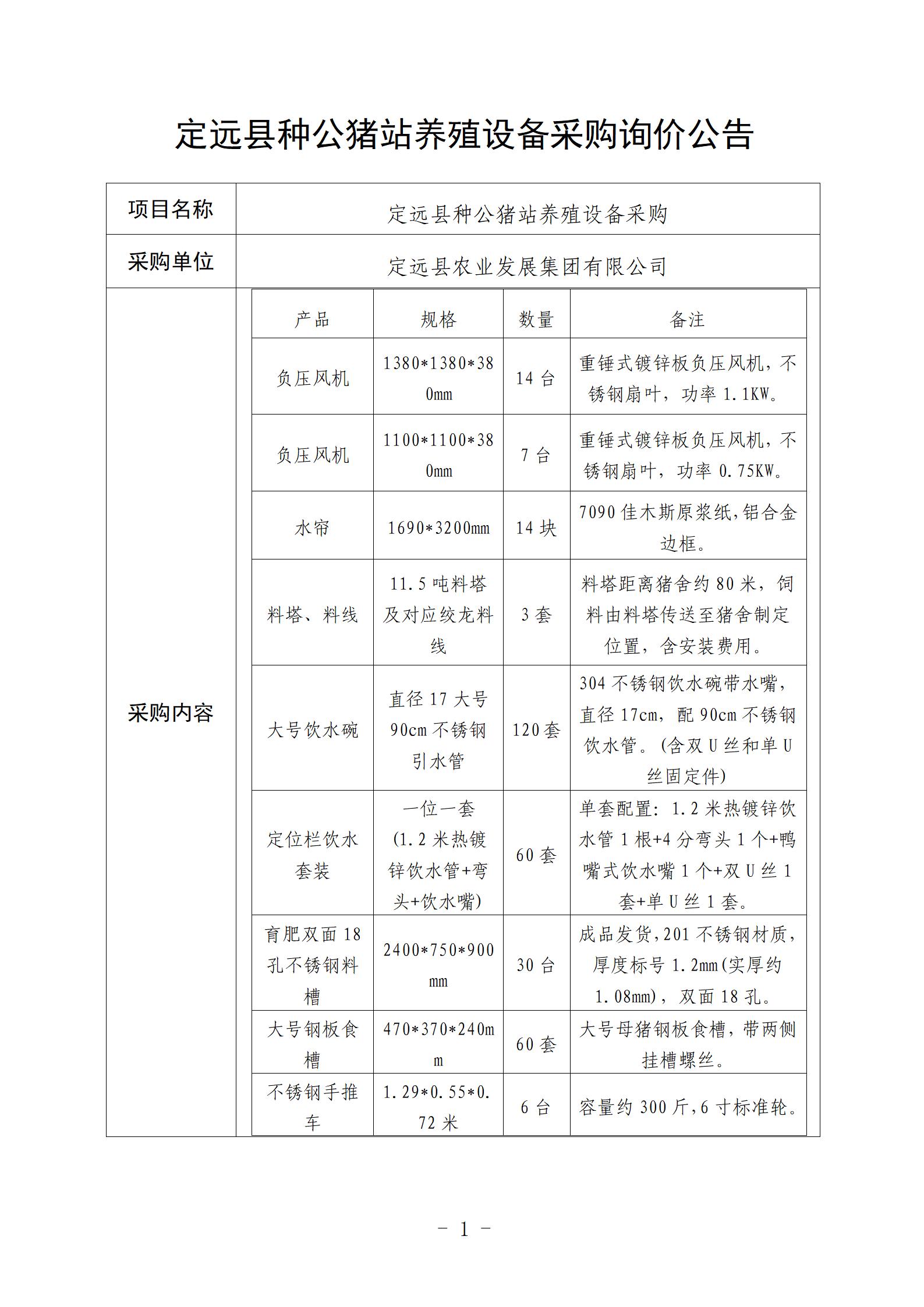 定远县种公猪站养殖设备采购询价公告