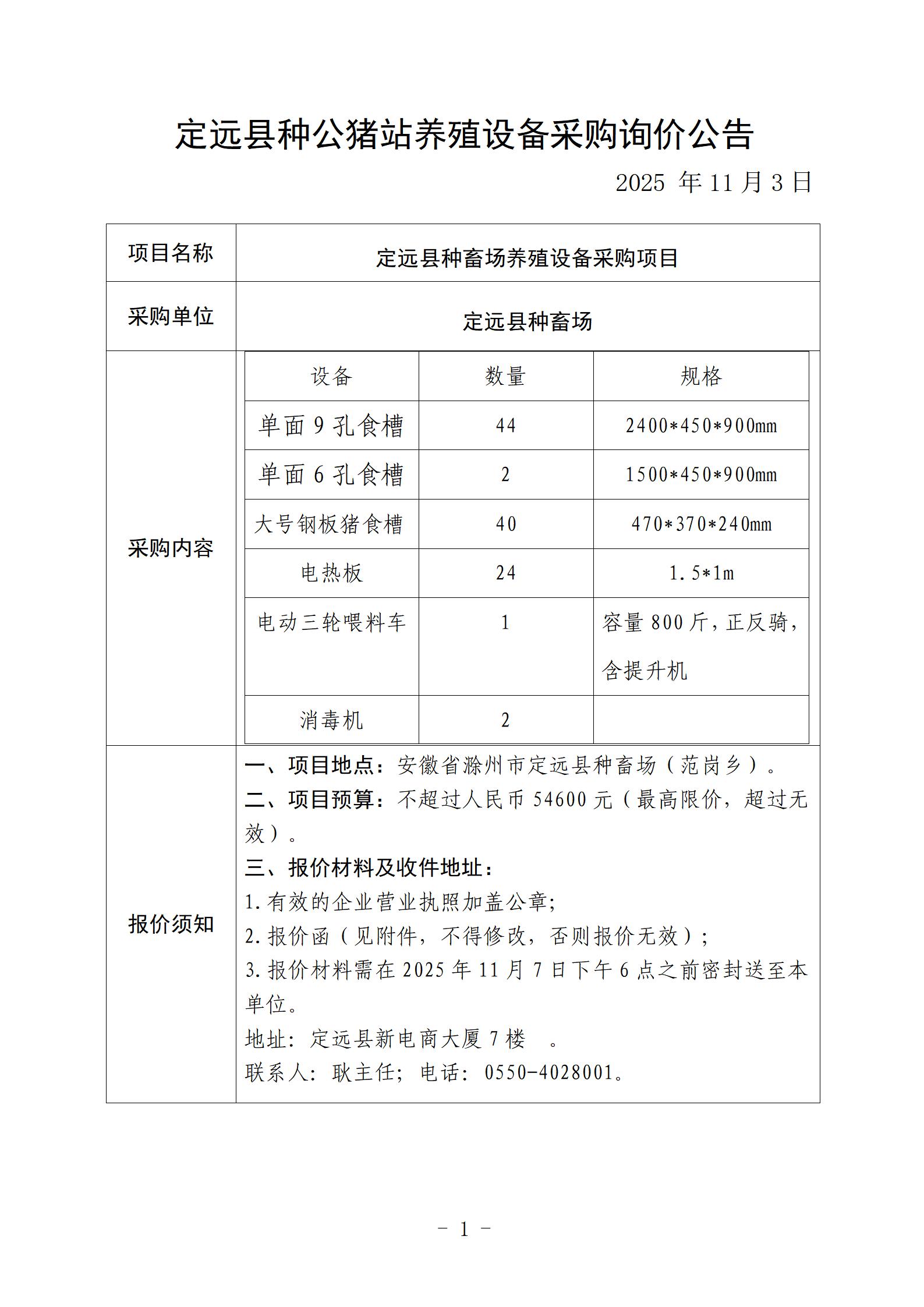 定远县种公猪站养殖设备采购询价公告