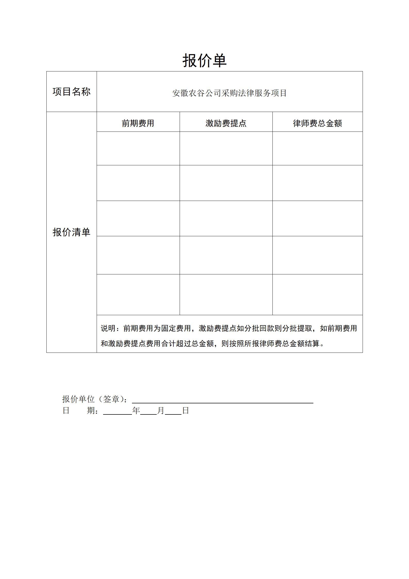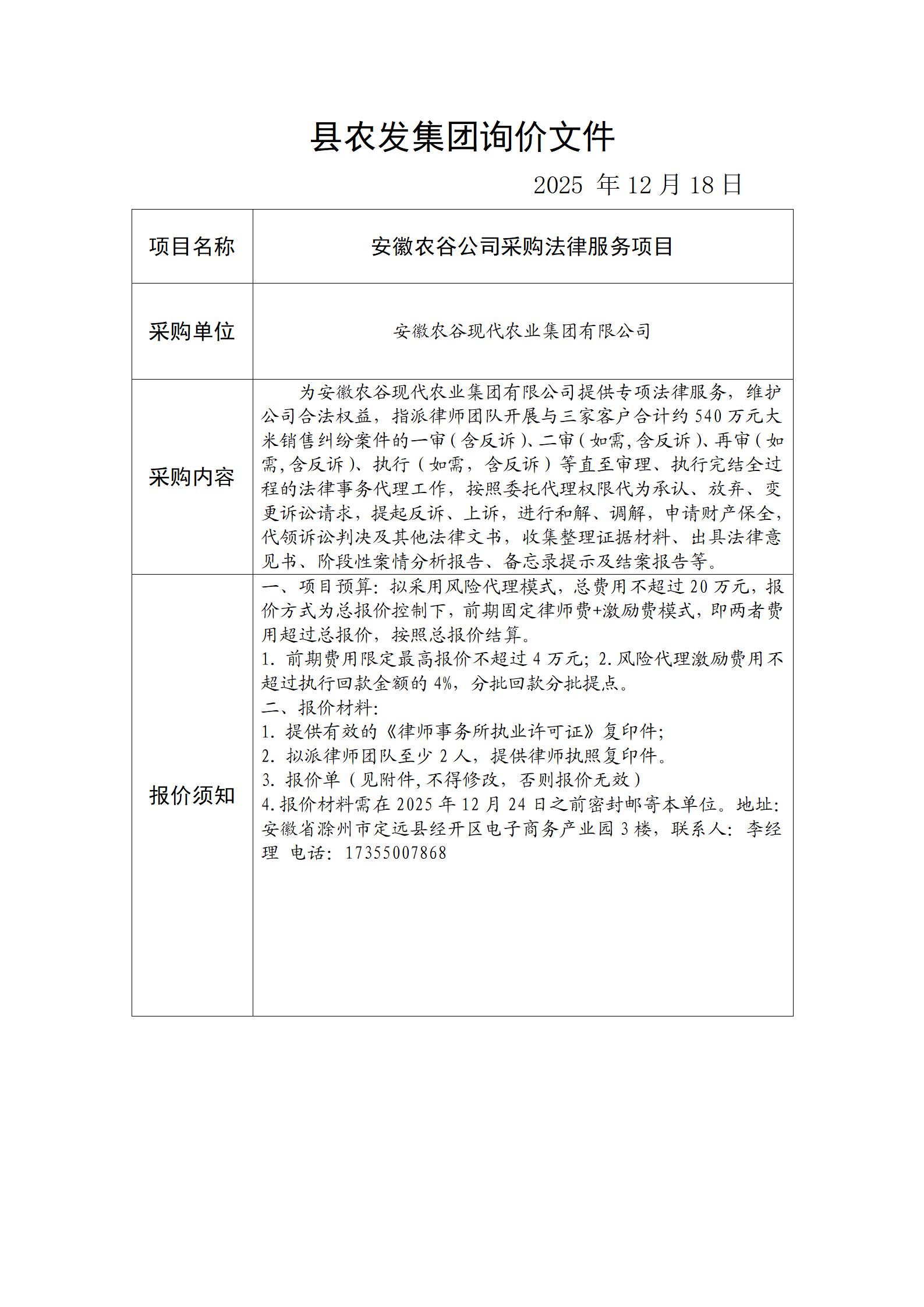 安徽农谷公司采购法律服务项目询价公告